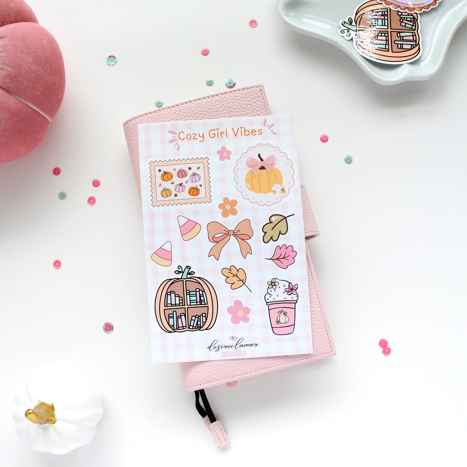 Bring soft autumn sweetness to your planner or journal with the Cozy Girl Vibes Glossy Sticker Sheet. Featuring pumpkins, bows, leaves, and cozy treats on a pink gingham background, this sheet adds the perfect touch of charm to your creative projects.