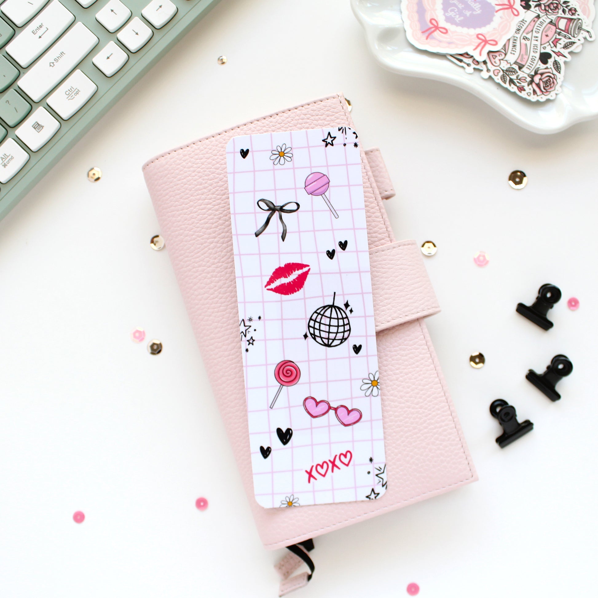 Stay cute while you read! The Girlie Pop Bookmark features the same fun doodles from the sticker sheet — lips, hearts, and disco vibes — printed on thick cardstock and sealed with a shiny laminate finish. A must-have for book lovers and planner girls alike.